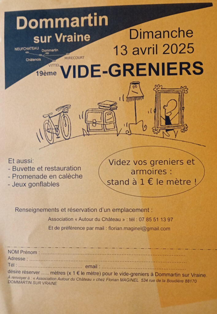 Vide-greniers à Dommartin sur Vraine organisé par l’association « Autour du Château » dimanche 13 avril de 6 h à 18 h.