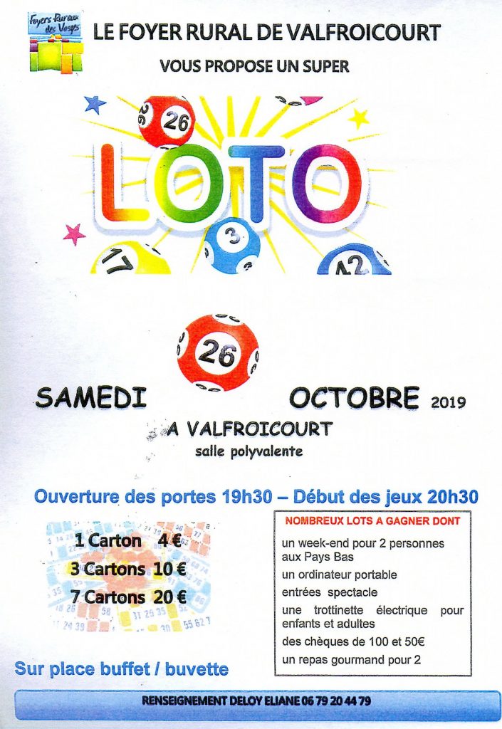 LOTO du FOYER RURAL à VALFROICOURT le samedi 26 octobre à la SALLE POLYVALENTE.