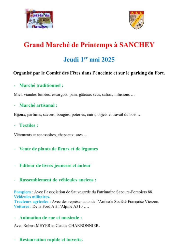 Le COMITÉ DES FÊTES organise son traditionnel Marché de Printemps dans l’enceinte et sur le parking du Fort de SANCHEY, Jeudi 1er mai . Marché traditionnel et artisanal. Vente de plants de fleurs et de légumes. Rassemblement de véhicules anciens. Restauration rapide et buvette.