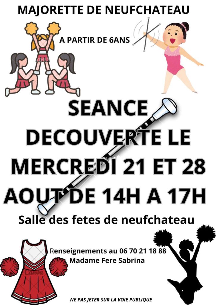 Les MYRIADES ETOILEES, majorettes de Neufchâteau, organisent deux séances découverte les mercredi 21 et 28 août de 14h à 17 h à partir de 6 ans, à la SALLE DES FETES de NEUFCHATEAU Renseignez vous au 06 702 118 88.