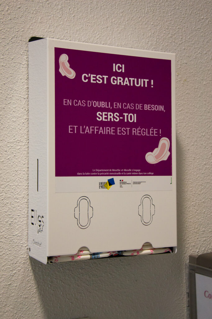 Si la première dotation est assurée par le Département, la gestion des réapprovisionnements est laissée à l’initiative des établissements. Au collège Valcourt à Toul, le distributeur « Elles Box » installé à côté de l’infirmerie est accompagné d’une « Give box » dans laquelle les filles comme les garçons, mais aussi les professeurs et les agents peuvent déposer des protections périodiques neuves.