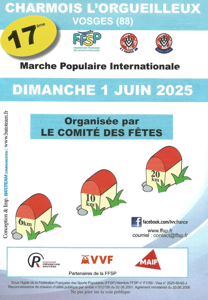 LE COMITÉ DES FÊTES organise une MARCHE POPULAIRE INTERNATIONALE à CHARMOIS L’ORGUEILLEUX, dimanche 1er juin, sous l’égide de la FFSP.