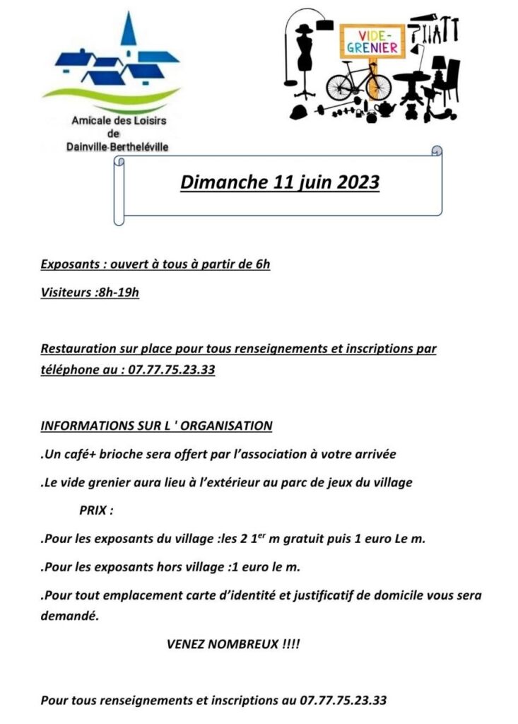 1er VIDE GRENIER à DAINVILLE-BERTHELÉVILLE dans le MEUSE (55) organisé par l’AMICALE DES LOISIRS le dimanche 11 juin. 1 € le ML. Café et brioche offerts aux exposants. Buvette et restauration sur place. Inscriptions au 07 77 75 23 33