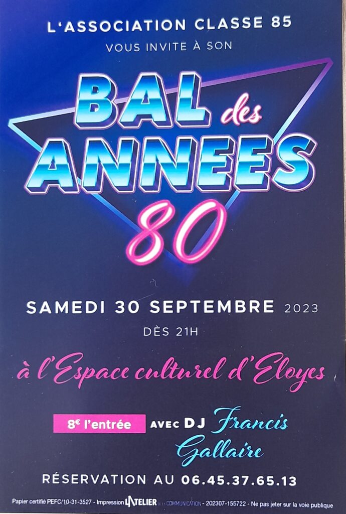 Le traditionnel BAL DES ANNEES 80, organisé par l’association CLASSE 85 d’ELOYES, aura lieu le samedi 30 septembre à partir de 21h00 à l’ESPACE CULTURE d’ELOYES.