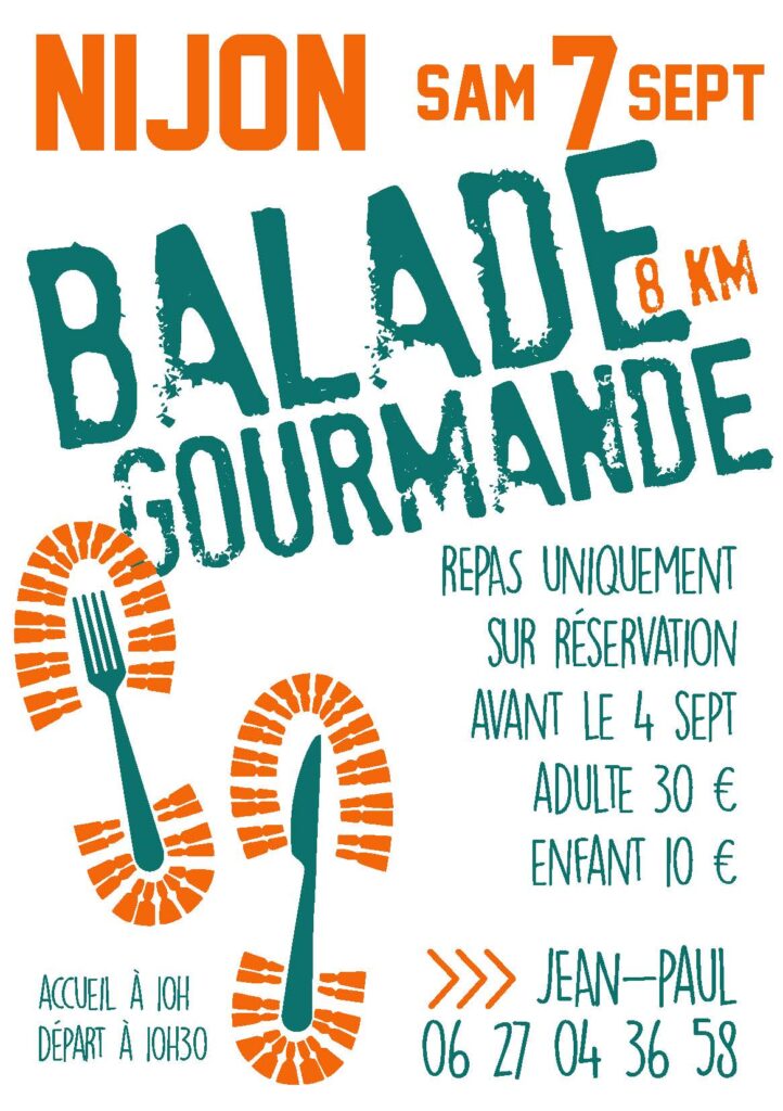 Dans un cadre naturel, venez profiter d’une BALADE GOURMANDE à NIJON le samedi 07 septembre. Un parcours de 8 kilomètres ponctué d’un repas en forêt et de plusieurs haltes gourmandes. L’accueil des marcheurs se fera à 10 heures sur la place du village, venez nombreux !