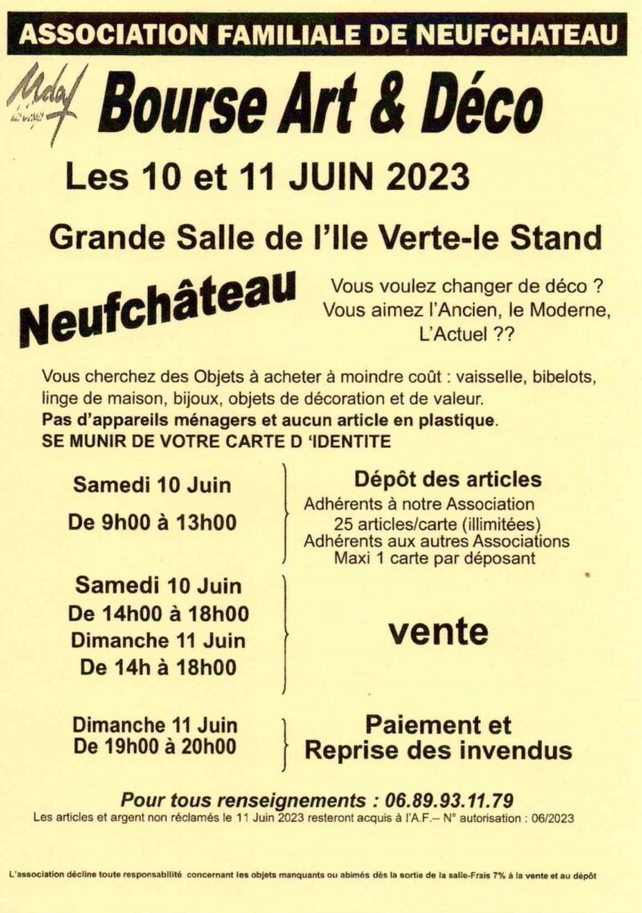 BOURSE ARTS DÉCO à NEUFCHATEAU à la SALLE DE L’ILE VERTE-LE STAND les 10 et 11 juin. Vaisselle, bibelots, linge de maison, bijoux fantaisie, objets de décoration, etc…. PAS d’APPAREILS MENAGER – D’ARTICLES PLASTIQUE- NI AUDIO VISUEL. Dépôts des articles : Samedi 10 juin de 9h à 13h. Vente : Samedi et Dimanche de […]