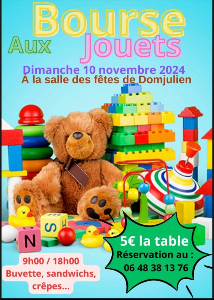 1ère BOURSE AUX JOUETS organisée par l’association Haut de Saint Michel dimanche 10 novembre à la SALLE DES FETES de DOMJULIEN de 9h à 18h.5 € la table. Pour toute réservation : 06.48.38.13.76Buvette, sandwich et crêpes sur place.