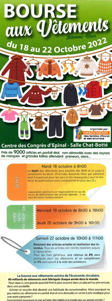 BOURSE AUX VETEMENTS à EPINAL du 18 au 22 octobre, au CENTRE DES CONGRES, salle CHAT BOTTÉ, organisée par l’association des familles d’Epinal et ses environs.