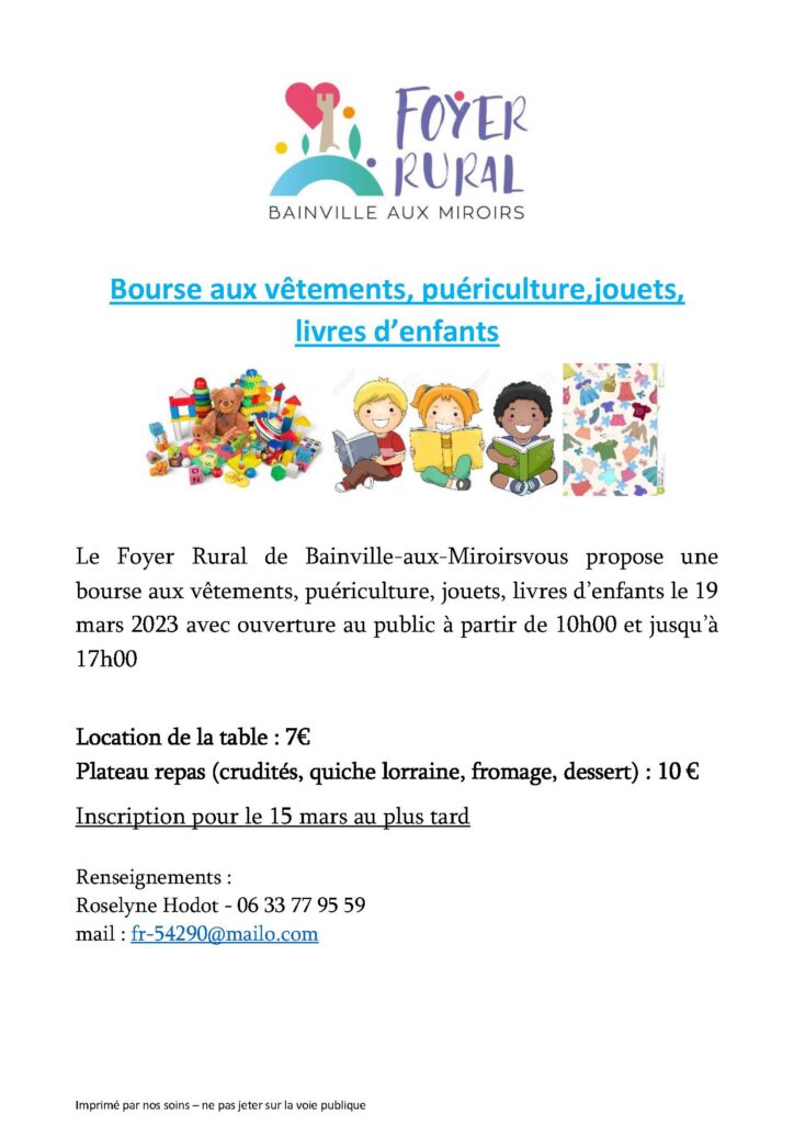 BOURSE AUX VETEMENTS, PUERICULTURE, JOUETS, LIVRES D’ENFANTS à la SALLE POLYVALENTE de BAINVILLE AUX MIROIRS dimanche 19 mars. Ouverture au public de 10h00 à 17h00. Exposants : 7 € la table. Plateau repas à 10 €. Infos et inscriptions au 06 33 77 95 59