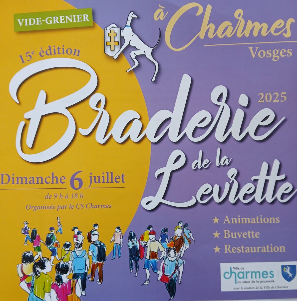 Le CS CHARMES organise la BRADERIE DE LA LEVRETTE au centre ville de CHARMES, dimanche 6 juillet, de 9h à 18h. Inauguration à 11h. Vide grenier, animation et jeux toute l’après-midi. Buvette et restauration sur place. Pour tout renseignement : 06 18 49 26 32.