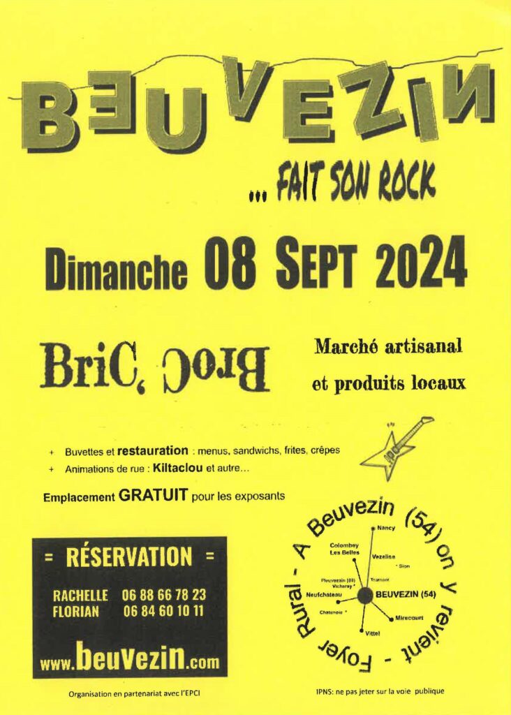 Le Foyer Rural « Le Moulin » de BEUVEZIN organise dans les rues du village un BRIC BROC et marché de produits locaux le Dimanche 08 septembre de 7h00 à 17h00.