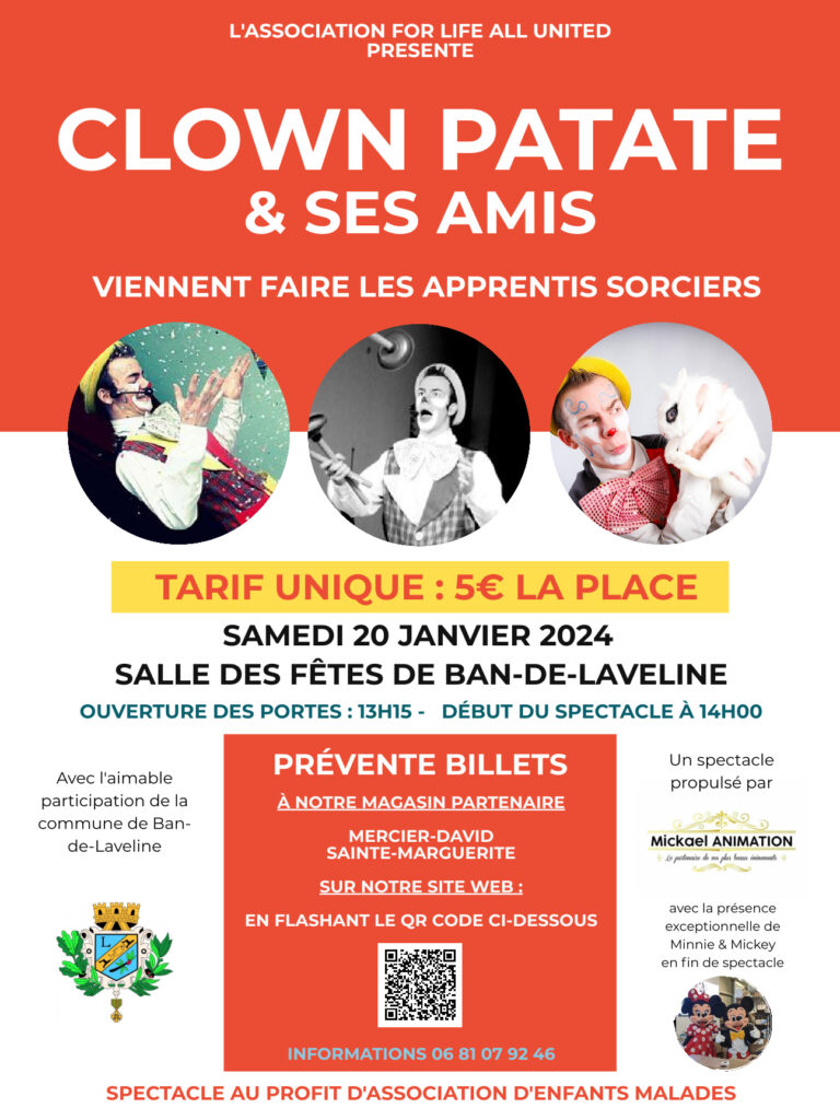 CLOWN PATATE & SES AMIS viennent faire les apprentis sorciers à la SALLE DES FETES de BAN-DE-LAVELINE le samedi 20 janvier. Spectacle au profit d’associations d’enfants malades, en présence de Minnie & Mickey. Début du spectacle à 14h00. + d’infos au 06 81 07 92 46