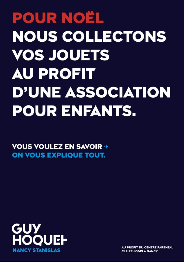 Venez déposer vos jouets ou livres, neufs ou en bon état, avant le 19 décembre à l’agence Guy Hoquet Nancy Stanislas, 33 rue des Carmes à Nancy. L’ensemble des dons sera remis aux enfants de l’association le 22 décembre.