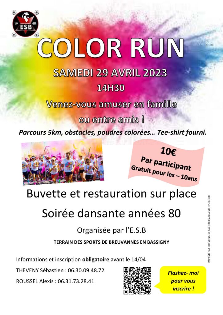 COLOR RUN à BREUVANNES-EN-BASSIGNY organisé par l’ETOILE SPORTIVE BREUVANNAISE le samedi 29 avril à 14h30 sur le TERRAIN DE SPORT de BREUVANNES.