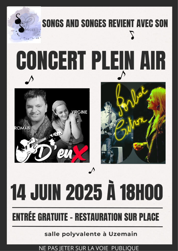 SONG AND SONGES organise un CONCERT EN PLEIN AIR à UZEMAIN, samedi 14 juin.