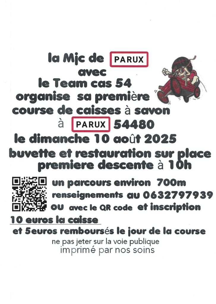 COURSE DE CAISSES A SAVON à PARUX organisée par la MJC et le TEAM CAS 54 le dimanche 10 août à partir de 10h00.