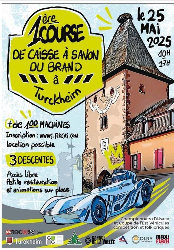 1ère course de caisse à savon à Turckheim (Route de Niedermorschwihr, près de Colmar) le dimanche 25 mai de 10h à 17h.Championnats d’Alsace et coupe de l’Est Véhicules compétition et folkloriques;Au programme, 3 descentes, plus de 100 machines.Accès libre et gratuit – animations et petite restauration sur place.