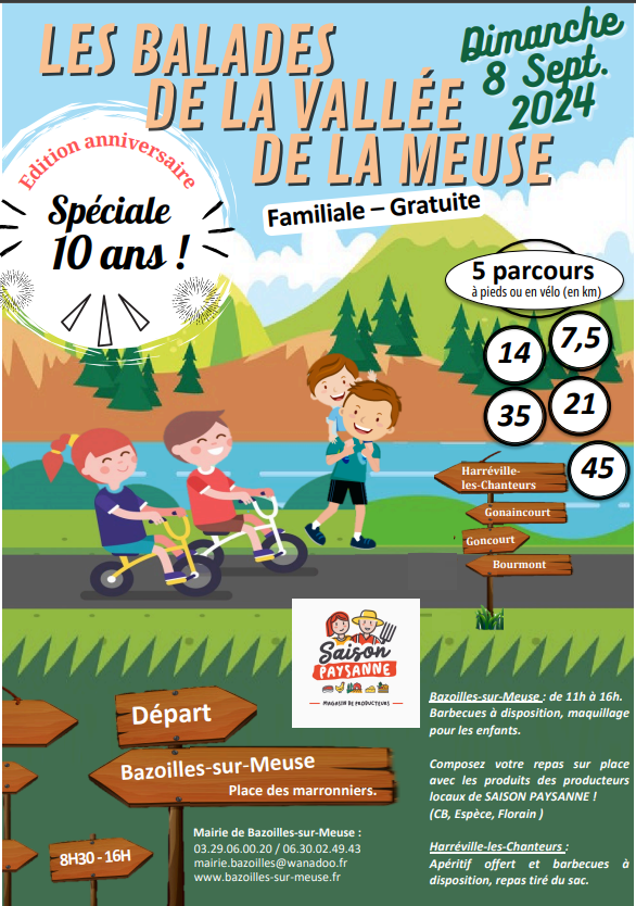 Randonnée gratuite et familiale à BAZOILLES-SUR-MEUSE dimanche 8 septembre avec plusieurs parcours de 7,5 à 45 kilomètres, destinés aux marcheurs et aux VTT. Un rendez-vous festif, semé d’animations et qui fête ses 10 ans !