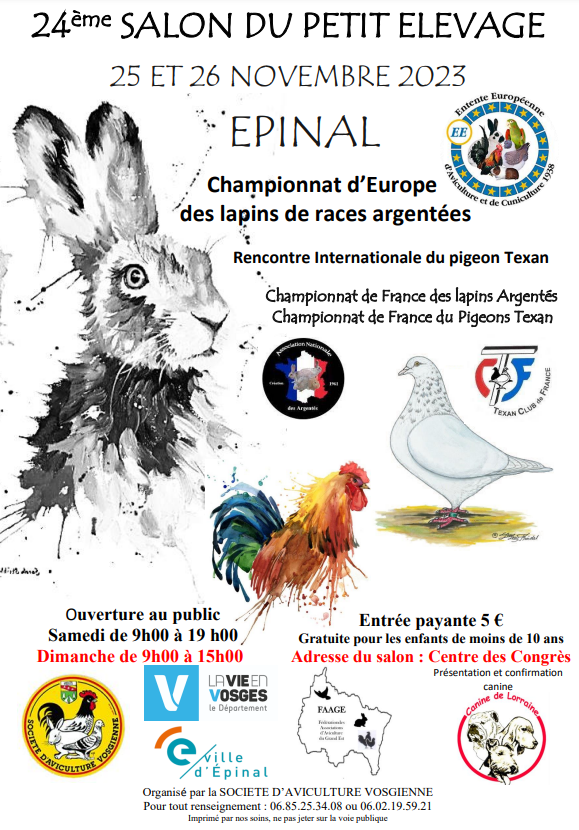 Championnat d’Europe des lapins de races argentées et Championnat de France de l’Association Nationale des Argentés. Rencontre Internationale du pigeon Texan. Championnat de France du Texan Club de France. Exposition de volailles et palmipèdes.