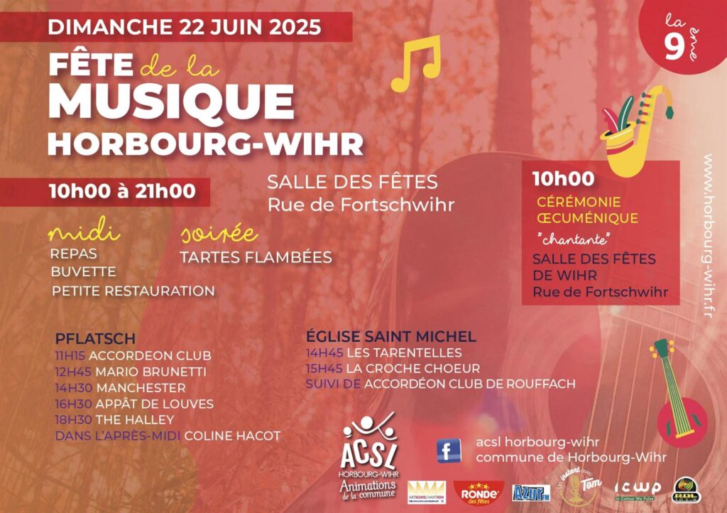 A l’occasion de la fête de la musique, la commune d’Horbourg Whir propose plusieurs concerts dès 10h le matin à la salle des fêtes. Rdv ce samedi 21 juin rue de Fortschwihr, la Platsch. Accès libre et gratuit.