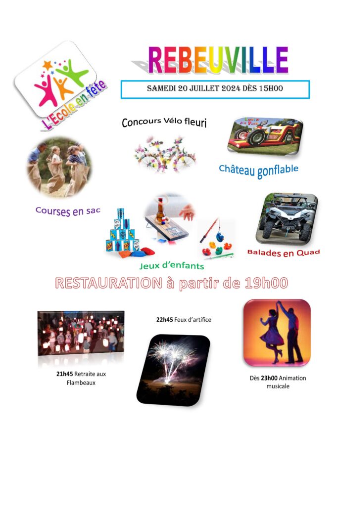 L’association « l’Ecole en fête » organise sa FÊTE DE L’ÉTÉ à REBEUVILLE samedi 20 juillet dés 14h30 sur la place du village. Jeux divers, château gonflable, ballade en quads et maquillages animeront cette après midi . Restauration sur place. En soirée, retraite aux flambeaux et feu d’artifice. Animation musicale pour terminée la soirée.