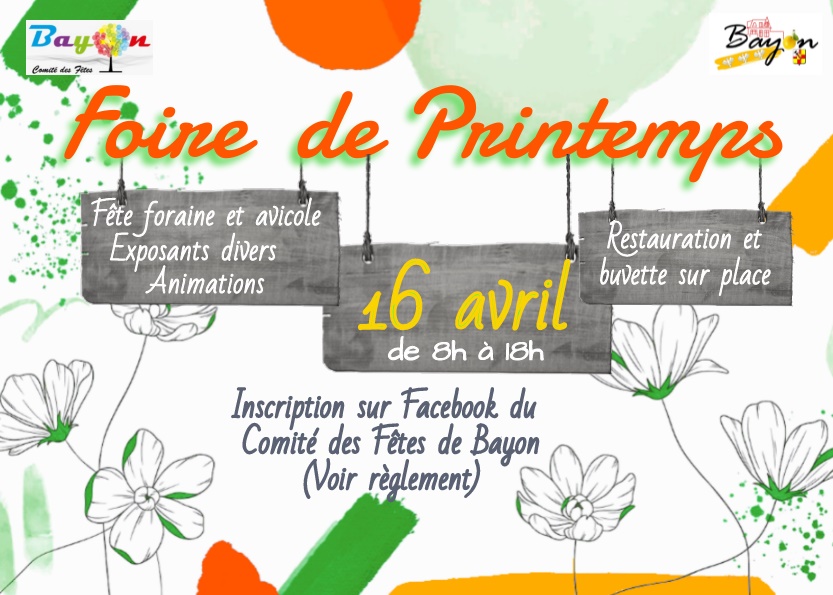 FOIRE DE PRINTEMPS à BAYON le dimanche 16 avril de 8h à 18h, organisée par la municipalité et le comité des fêtes de Bayon.