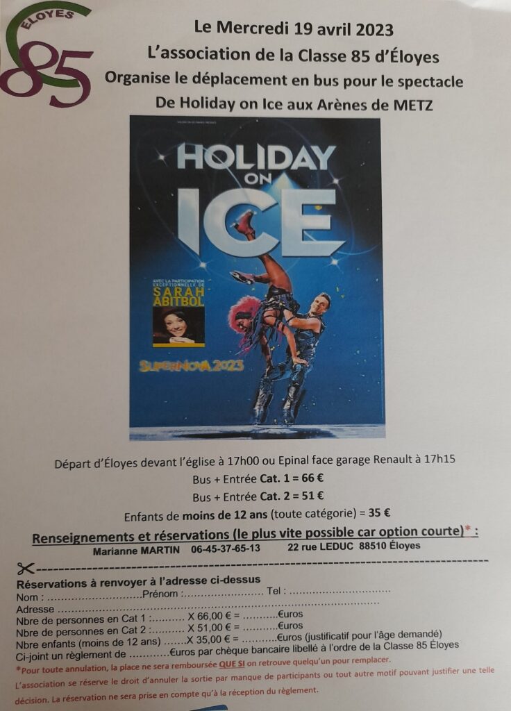 L’association CLASSE 85 de ELOYES organise un déplacement en bus pour aller voir HOLIDAY ON ICE aux ARENES DE METZ le mercredi 19 avril.