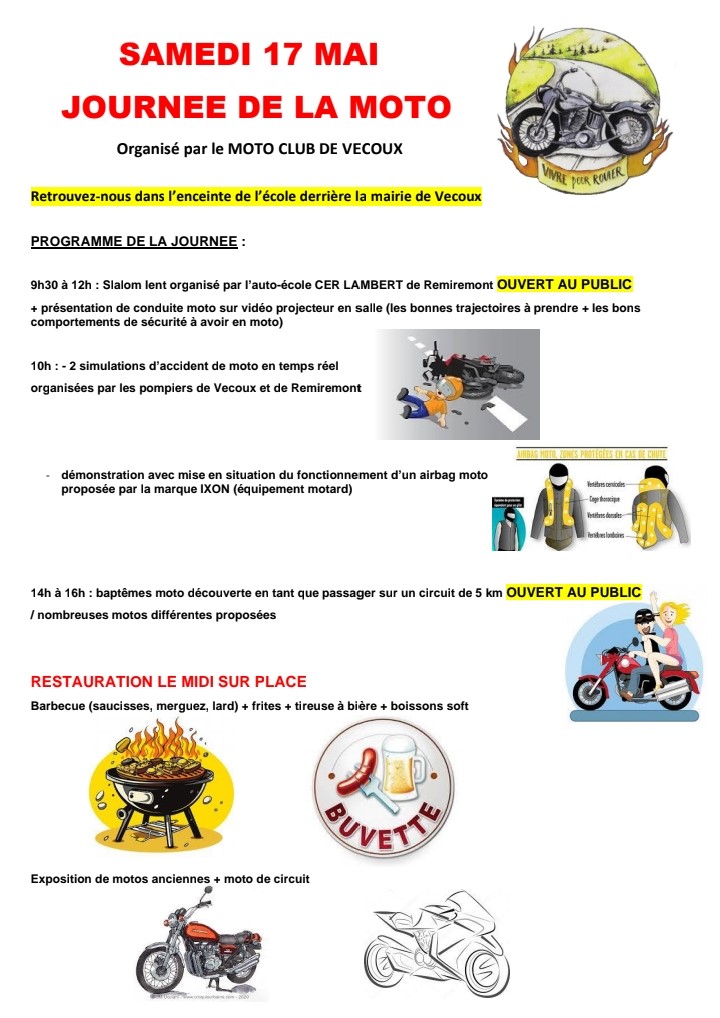 JOURNÉE DE LA MOTO organisée par le MOTOCLUB de VECOUX samedi 17 mai de 9h30 à 17h. le matin : – présentation de la conduite et des risques en moto (par la moto-école CER LAMBERT) – parcours lent en moto sur circuit fermé. – simulations d’accident de moto des sapeurs pompiers de Vecoux et de […]