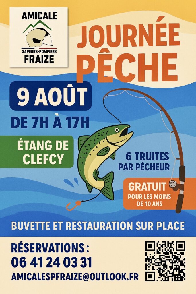 L’AMICALE DES POMPIERS DE FRAIZE organise une JOURNÉE PÊCHE à l’étang de CLEFCY, samedi 9 août, de 7h à 17h.