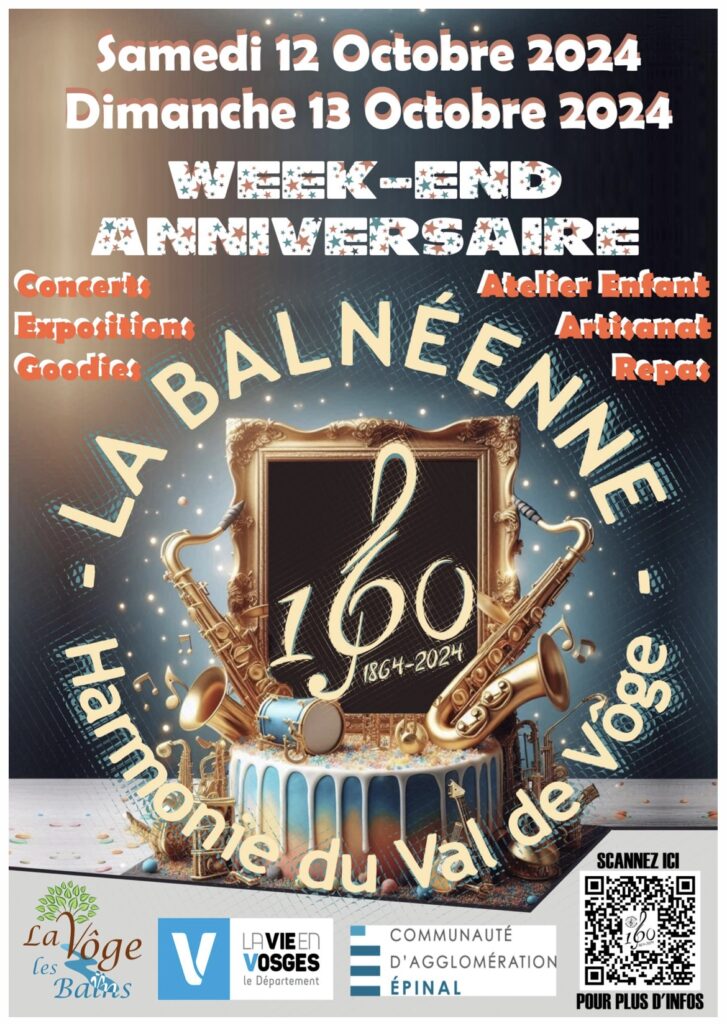 Weekend musical et festif pour les 160 ans de la Balnéenne, harmonie du Val de Vôge, les 12 et 13 octobre 2024 à Bains-les-Bains. Buvette et restauration en produits locaux. Concerts, expositions, atelier enfants, goodies et marché artisanal. Evènement exceptionnel à partager sans modération.