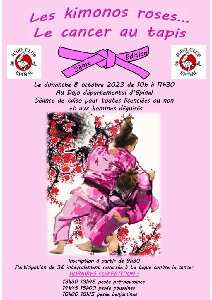 3ème édition des KOMONOS ROSES « le cancer au tapis », au DOJO DEPARTEMENTAL D’EPINAL, organisée par le JUDO CLUB SPINALIEN Dimanche 8 octobre de 10h à11h30.