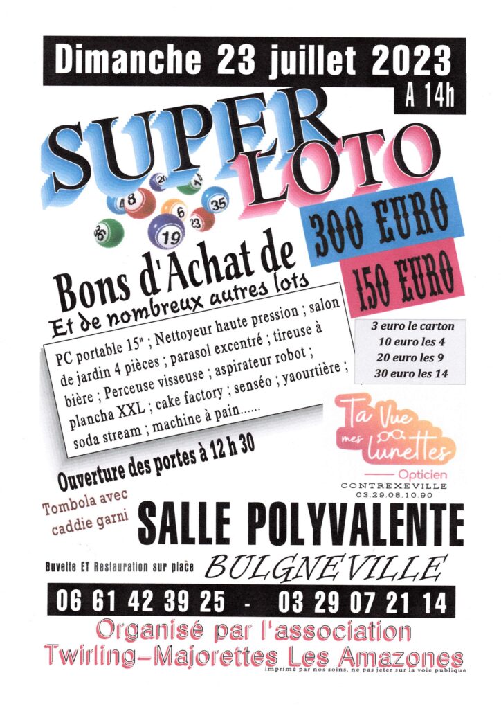 LOTO organisé par TWIRLING MAJORETTES « LES AMAZONES » dimanche 23 juillet à 14h00 à la SALLE POLYVALENTE de BULGNÉVILLE.