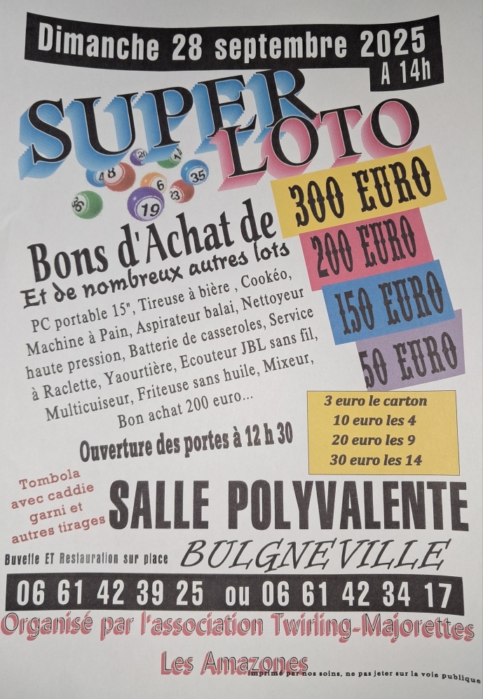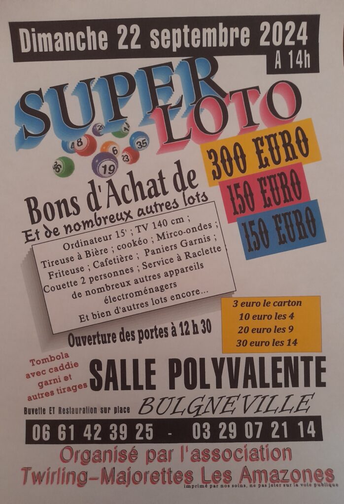 LOTO du TWIRLING-MAJORETTES LES AMAZONES à la SALLE POLYVALENTE de BULGNÉVILLE dimanche 22 septembre.