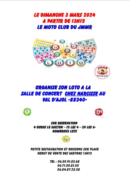 Le MOTO CLUB JMMR organise sont LOTO « CHEZ NARCISSE » au VAL D’AJOL dimanche 3 mars à partir de 13h15.