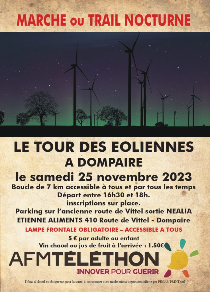 Marche ou Trail nocturne et accessible à tous, en faveur du Téléthon, le samedi 25 novembre, Route de Vittel à Dompaire. Boucle de 7 km à faire une ou plusieurs fois. Départ entre 16h30 et 18h. Lampe frontale obligatoire. Inscriptions sur place : 5 €/personne. Vin chaud et chocolat chaud à l’arrivée. + d’infos au […]