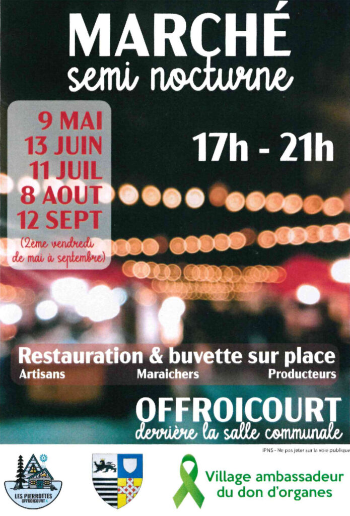 L’Association LES PIERROTTES organise pour la deuxième année consécutive un MARCHÉ SEMI-NOCTURNE, le 2èmevendredi de chaque mois, de juin à septembre, de 17h à 21h. Présence d’artisans, de producteurs, traiteurs… Buvette et restauration sur place. Pour les producteurs intéressés, vous pouvez contacter l’association via sa page Facebook « Les Pierrottes – Offroicourt ».