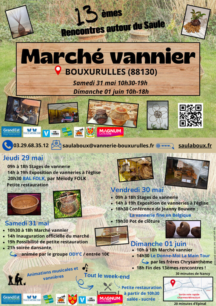 Dans le cadre des 13èmes Rencontres Autour du Saule, festival de vannerie, rendez-vous au Marché Vannier à Bouxurulles, sur la place du village, le samedi 31 mai et le dimanche 1er juin.