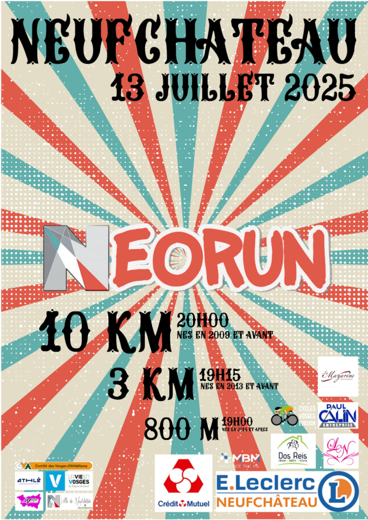 L’ATHLÉTIC CLUB NÉOCASTRIEN organise la NÉORUN, course emblématique de 10km, à NEUFCHÂTEAU, dimanche 13 juillet. Venez partager en famille ou entre amis un moment sportif et festif au cœur de Neufchâteau. Parcours, informations, horaires et inscriptions sur les pages instagram et facebook de l’ATHLÉTIC CLUB NÉOCASTRIEN. Inscription sur place possible.