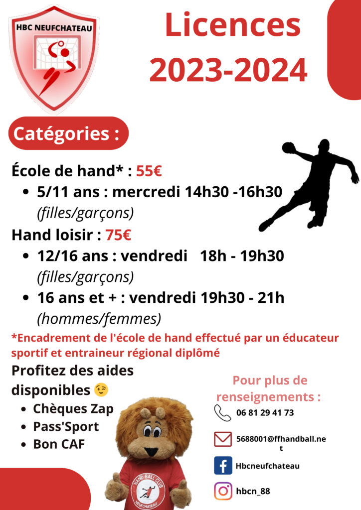 Reprise de l’école de HANDBALL à NEUFCHATEAU pour les 5-11 ans à partir du mercredi 6 septembre de 14h30 à 16h30 avec un entraineur diplômé. Et reprise des entrainements en hand loisir des 12-16 ans à partir du vendredi 8 septembre de 19h à 20h30 puis des + de 16 ans de 20h30 à 22h. […]