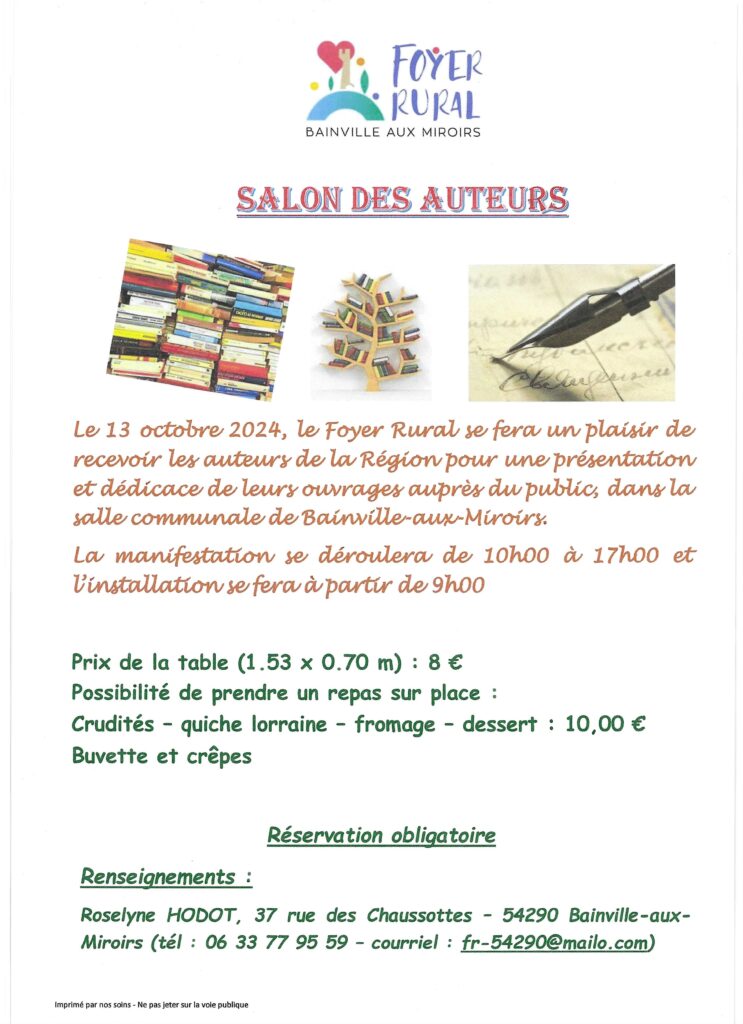 3ème SALON DES AUTEURS à BAINVILLE-AUX-MIROIRS organisé par le foyer rural. + de 25 auteurs de la Région et autres, vous présenteront et dédicaceront leurs ouvrages à la SALLE COMMUNALE de BAINVILLE-AUX-MIROIRS dimanche 13 Octobre de 10h à 17h. Restauration, vente de crêpes et buvette sur place. Entrée gratuite.