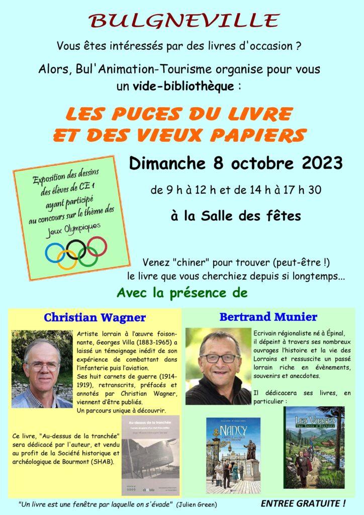 Organisé par « Bul’Animation-Tourisme », le 8ème Salon des « Puces du livre et des vieux papiers » dimanche 9 octobre à la Salle des Fêtes de BULGNÉVILLE.