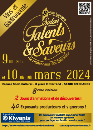SALON TALENTS ET SAVEURS DE LORRAINE organisé par le KIWANIS CLUB DE NANCY les 09 et 10 MARS à l’ESPACE SOCIO-CULTUREL DE SEICHAMPS.