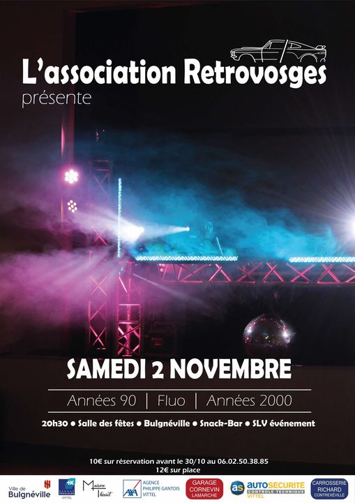 SOIREE ANNEE 90-2000 Salle du LAC des RECOLLETS à BULGNEVILLE samedi 2 novembre à partir de 20h30. Soirée animée par SLV EVENEMENTS, dans une ambiance FLUO. Buvette et petite restauration sur place. 12 € l’entrée sur place ou 10 € sur réservation au 06 02 50 38 85
