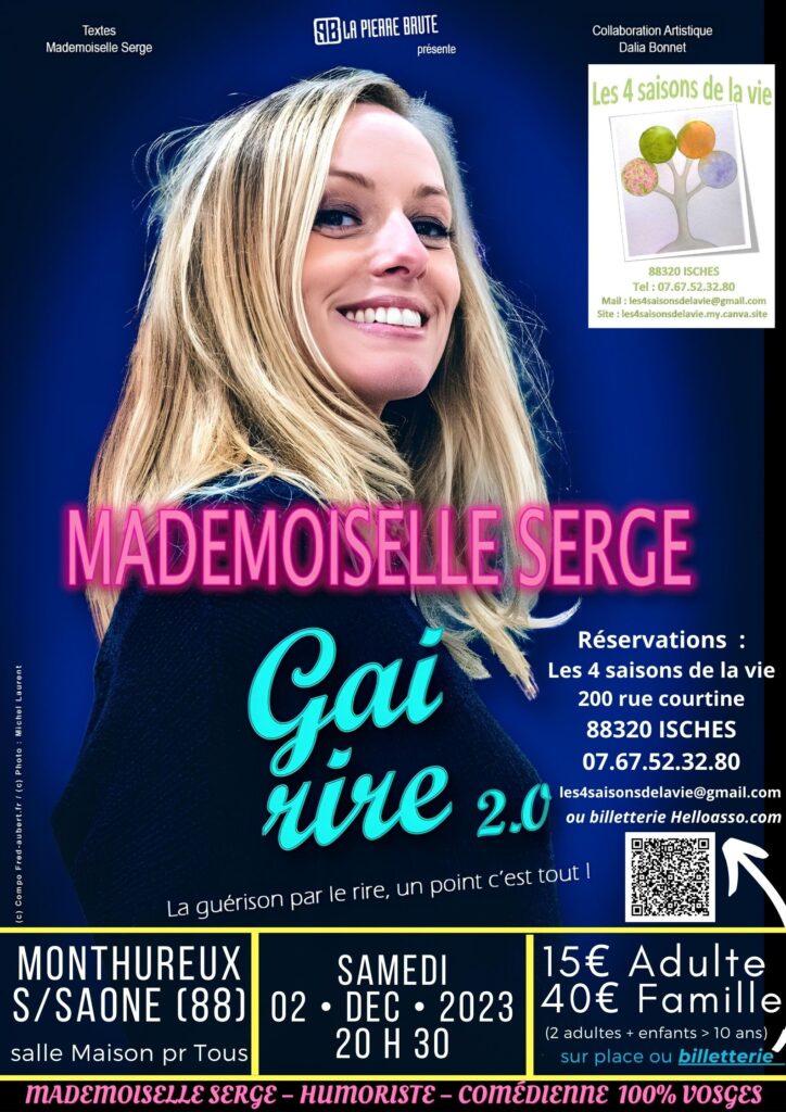 Les 4 saisons de la vie (Isches), association dont les buts principaux sont de promouvoir le Bien-être, le Bien vivre, le Bien manger et le partage jusqu’à bien vieillir, accueille MADEMOISELLE SERGE – Humoriste – Comédienne 100 % vosgienne, pour son spectacle : GAI RIRE 2.0 à la MAISON POUR TOUS de MONTHUREUX/SAONE le samedi 2 décembre à 20h30. (Un one woman show drôle et inspirant).