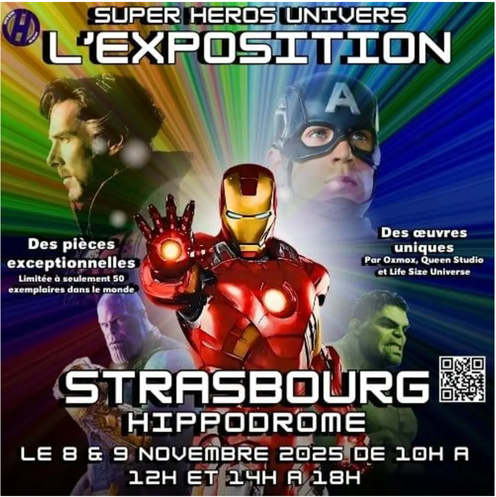 L’exposition Super Héros Univers aura lieu àl’hippodrome de Strasbourg les 8 et 9 Novembre de 10h à 12h et de 14h à 18h. Au cours de votre visite, vous pourrez admirer 30 statues en taille réelle. Chaque personnage est présenté avec son propre décor fidèle au film, agrémenté d’effets spéciaux holographiques pour une immersion totale dans l’univers des super-héros. Plongez dans l’histoire des personnages légendaires tels que Captain America ou encore Iron man.