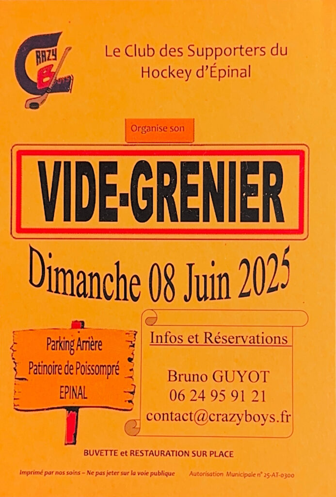 Le club des supporters du Hockey d’Epinal, LES CRAZY BOYS, organise un VIDE GRENIER sur le parking arrière de la patinoire de Poissompré d’ÉPINAL, dimanche 8 juin, de 6h à 18h.