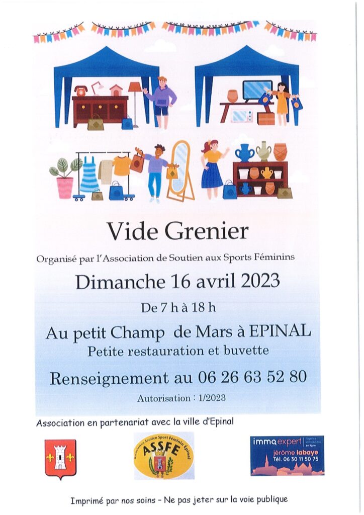 VIDE GRENIER à EPINAL au PETIT CHAMPS DE MARS le dimanche 16 avril, organisé par l’association de soutien aux sports féminins d’Epinal en partenariat avec la ville d’Epinal et Jérôme immo-expert.