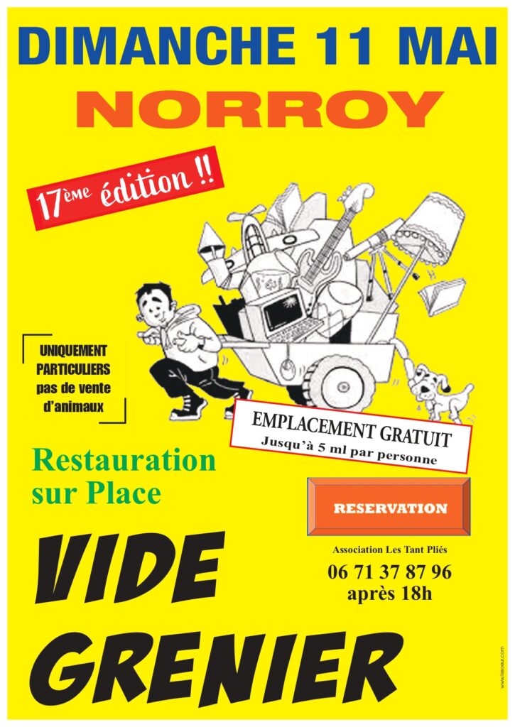 L’association LES TANT PLIES organise un VIDE GRENIER réservé uniquement aux particuliers à Norroy, dimanche 11 mai. Emplacement gratuit jusqu’à 5m par personne. Buvette et restauration sur place. Exposition et vente d’animaux interdites. Infos et réservations au 06 71 37 87 96 après 18 H.