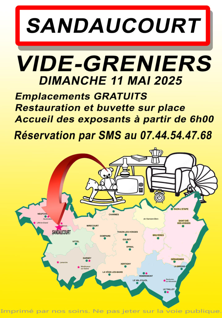 LE COMITÉ DE LOISIRS ET DE LA CULTURE DE SANDAUCOURT organise un VIDE GRENIER, dimanche 11 mai 2025. Emplacement gratuit . Buvette et restauration sur place avec 2 chapiteaux. Réservation par SMS au 07 44 54 47 68.