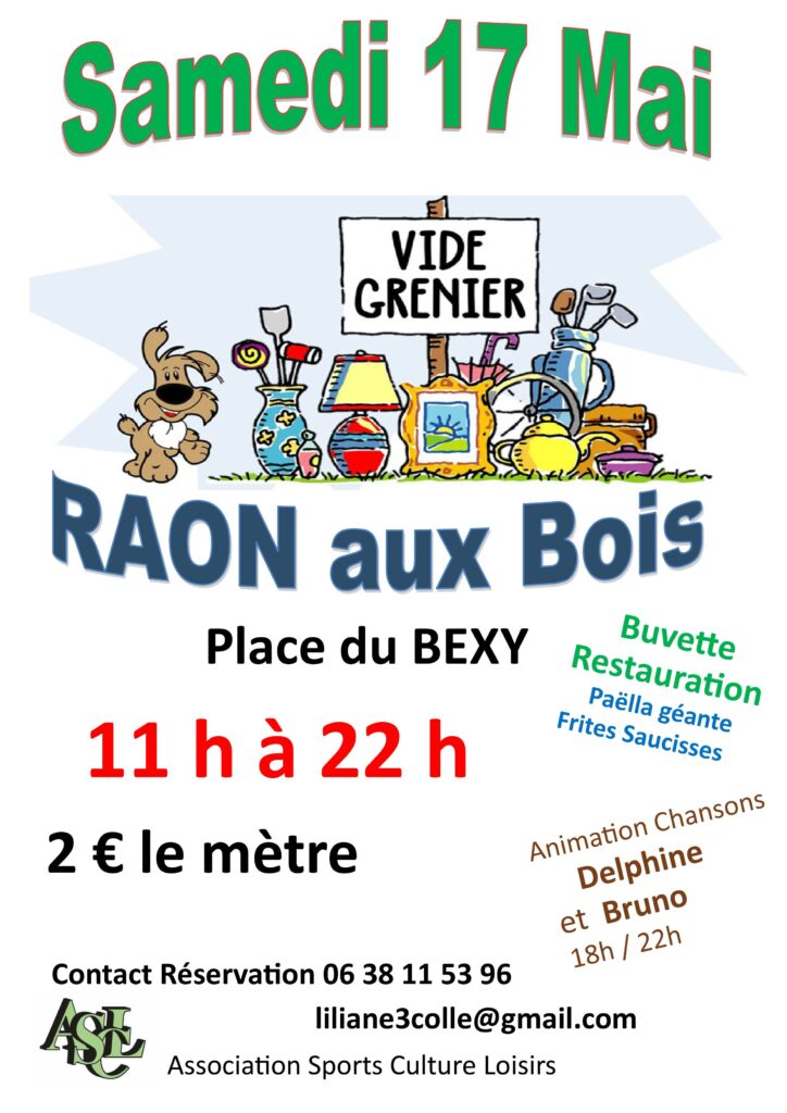 L’association ASCL organise un vide grenier à RAON AUX BOIS, samedi 17 mai de 11h à 22h. Tarif exposants : 2 € le mètre . Buvette et restauration sur place avec Animation chansons interprétées par Delphine et Bruno. Infos et inscription au 06 38 11 53 96.